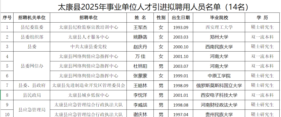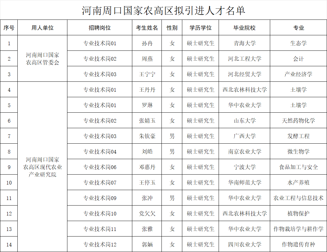 ![]() 河南周口国家农业高新技术产业示范区 拟引进人才公示 根据 周口市事业单位2025年第一批人才引进公告 等有关要求 河南周口国家农业高新技术产业示范区2025年人才引进工作已于去年年底前完成报名 资格审查 笔试 面试 体检 考察等程序 并确定孙冉等14名同志为拟引进对象 其中农高区管委会拟引进3人 农高区现代农业产业研究院拟引进11人 具体名单见附件 由于农高区管理体制机制改革等原因 拟引进人才公示工作延迟至今 公示时间为2026年3月18日至2026年3月26日 资格审查贯穿人才引进全过程 欢迎社会各界进行监督 监督电话 0394-8269797 中共周口市委人才工作领导小组办公室 2026年3月17日 ![]() 太康县2025年事业单位人才引进 拟聘用人员公示 按照 太康县2025年事业单位人才引进公告 及有关规定 根据笔试 面试 体检 政审考察等结果 现将14名拟聘用人员进行公示 公示时间 2026年3月17日至3月25日 如对公示对象有异议 请于公示期内向县招才引智工作领导小组办公室反映 电话 0394-6816519 附件 太康县2025年事业单位人才引进拟聘用人员名单.xls 太康县招才引智工作领导小组办公室 2026年3月17日 ![]() ![]() 法律顾问/宋军魁 河南众望律师事务所 |