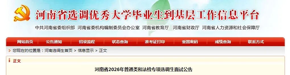 ![]() 河南省2026年招录普通类 法检专项选调生笔试工作已经结束 按照 关于2026年选调优秀应届大学毕业生到基层工作的通知 要求 依据笔试成绩从高到低排序 录用名额1:3的比例确定面试人员 共确定参加面试考生3856人 其中 普通类3361人 法检专项495人 现公告如下 一 面试分数线 普通类岗位 ![]() 法检专项岗位 ![]() 二 面试时间地点 面试时间定于2026年3月28日 考生在所报考省辖市面试 具体时间地点另行通知 三 有关事项 1.请考生近期保持通讯工具畅通 面试地点确定后会逐一电话通知 2.资格审查贯穿招录工作全过程 弄虚作假或提供影响录用不实信息的 一经发现取消进入下一环节资格 3.本次考试不指定考试辅导用书 不举办也不委托任何机构举办考试辅导培训班 4.考生如有特殊情况 可直接与所报考省辖市联系 郑州市 王思宇18703864916 开封市 张博伦16627885573 洛阳市 叶雨菲18537959790 平顶山市 董淑艳17656377166 安阳市 李硕18803721602 鹤壁市 郭艳18503920326 新乡市 赵 乾18625943345 焦作市 李捷18639183958 濮阳市 赵 锐15839350573 许昌市 张 鑫17537453611 漯河市 李月星13939595012 三门峡市 翟 臻18639870003 南阳市 郝一鸣16637766612 商丘市 郭 敏18298313252 信阳市 吕晓玲13839751958 周口市 董 超16691813990 驻马店市 杨川13939601011 济源示范区 苗淼18539161789 郑州航空港区 吴亚明 18603857018 附件 1.普通类进入面试人员名单 2.法检专项进入面试人员名单 中共河南省委组织部 2026年3月23日 普通类进入面试人员名单 周口部分 ![]() ![]() ![]() ![]() ![]() ![]() ![]() ![]() ![]() ![]() ![]() ![]() 法检专项进入面试人员名单 周口部分 ![]() ![]() ![]() 法律顾问/宋军魁 河南众望律师事务所 |