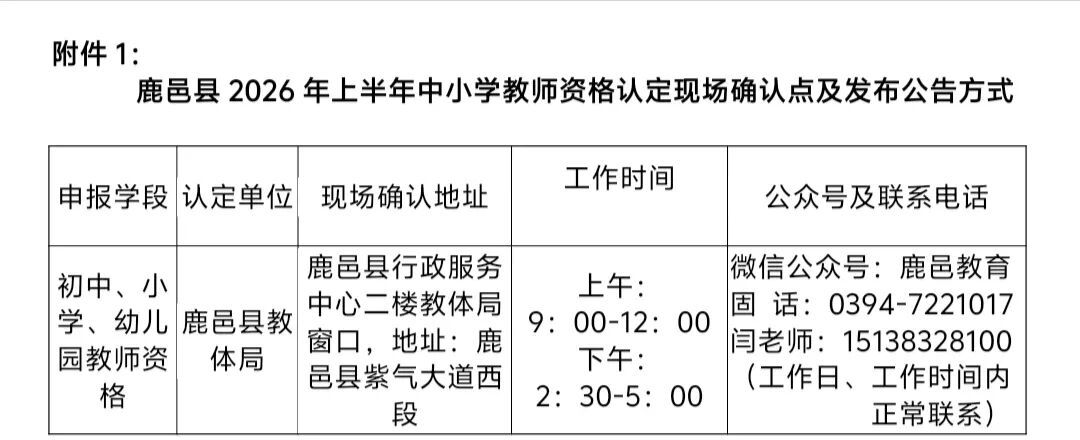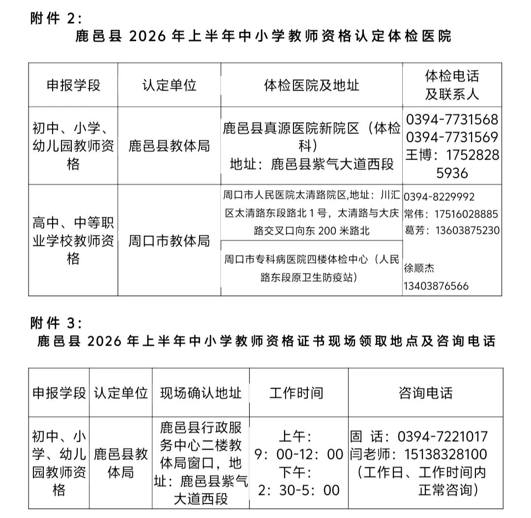 一 认定流程和时间 一 网上报名 1.第一批次 2026年4月7日8 00-4月17日17 00 符合条件的申请人可在报名期限内登录中国教师资格网 www.jszg.edu.cn 报名 申请人在网站首页点击"网上办事" 然后点击"教师资格认定-网上办理"后按照系统提示进行身份注册 填报并提交申请信息 按照网站要求上传本人证件照片 近期1寸白底免冠正面证件照 图片应为jpg格式 文件应小于190kb 网报时在"请选择考试形式"一栏中 参加国家统一考试取得 中小学教师资格考试合格证明 的申请人应选择"国家统一考试" 取得 师范生教师职业能力证书 的申请人应选择"免试认定改革人员" 2015年 含 之前入学的全日制普通院校师范生和全日制教育硕士申请应选择"非国家统一考试 含免考 " 建议应届毕业生取得毕业证书后再申请认定报名 报名时选择"非在读人员"身份 并进行学历校验 如果应届毕业生在取得毕业证之前申请认定的 需在毕业后 及时登录报名系统补充学历信息 并进行学历校验 只有成功补充学历之后 才能实现在线查询本人本次获得的教师资格证书信息 未完成补充学历信息的申请人不能在线查询本人本次获得的教师资格证书信息 不能领取教师资格证书原件 补充学历操作方法见中国教师资格网 https://www.jszg.edu.cn -"咨询服务"-"使用手册"栏目的 教师资格认定申请人使用手册 二 体检 体检结束后请密切关注本人系统留言栏信息和系统状态变化 三 审核 本次鹿邑县认定原则上采取"全程网办"模式 非统考类型的申请人除外 审核环节在网上进行 原则上无需申请人到达现场提交材料 各认定机构收到体检合格材料后才能进行审核 审核前报名系统显示个人申请事项办理状态为"网报待确认" 审核通过后报名系统显示个人申请事项办理状态为"待认定审批" 如果提供材料存在不规范 不完整情况 认定机构会给予"材料待完善"确认意见 请本人及时按照系统留言要求补充完善材料 特别提醒 2015年及以前入学的往届师范生以及留言栏显示"需现场审核"的申请人需要到各级教师资格认定机构指定地点提交材料进行现场审核 其余人员一般无需到认定现场进行提交材料 现场确认地点见附件1 第一批认定人员现场确认时间为 2026年4月27日-4月29日 2015年及以前入学的全日制普通院校师范类毕业生 如毕业证书中无明确标注"师范"字样 需提供由毕业院校验印的个人在校期间全部所学课程成绩单 有必修科目教育学 教育心理学的考试和教育实习合格成绩 并另提供以下证明材料 有一项即可 四 认定结论 五 领取证书 选择现场领取证书的请携带本人身份证原件在规定时间内到指定地点领取 仅限工作日内 领取地点见附件1 具体领取时间如下 一 未达到国家法定退休年龄 户籍所在地 居住地 须持有效期内当地居住证 就读学校所在地 仅限全日制应届毕业生 在鹿邑县的中国公民 二 驻鹿部队现役军人和现役武警 三 港澳台居民持港澳台居民居住证可在内地 大陆 居住所在地申请参加中小学教师资格考试和认定中小学教师资格 港澳居民持港澳居民来往内地通行证 台湾居民持五年有效期台湾居民来往大陆通行证可在内地 大陆 申请参加中小学教师资格考试 在考试所在地认定中小学教师资格 申请认定教师资格的学历及其他条件 程序要求与内地 大陆 申请人相同 三 认定条件 二 学历条件 应当具备 中华人民共和国教师法 规定的相应学历 具体如下 申请幼儿园教师资格的 应当具备幼儿师范学校毕业及以上学历 申请小学教师资格的 应当具备中等师范学校毕业及其以上学历 申请初级中学教师资格的 应当具备高等师范专科学校或者其他大学专科毕业及其以上学历 申请高级中学和中等职业学校 文化课 专业课 教师资格的 应当具备高等师范院校本科或者其他大学本科毕业及其以上学历 申请中等职业学校实习指导教师资格的 应当具备中等职业学校毕业及其以上学历 并具有相当助理工程师及以上专业技术职务或者中级及以上工人技术等级 三 教育教学能力 四 普通话条件 普通话水平应当达到国家语言文字工作委员会颁布的 普通话水平测试等级标准 二级乙等及以上标准 五 体检条件 符合 河南省教师资格申请人员体格检查标准 体检合格 可从河南省教师资格网http://jyt.henan.gov.cn/jszg/查询 依据 教师资格条例 规定 弄虚作假 骗取教师资格的 由县级以上人民政府教育行政部门撤销其教师资格 自撤销之日起5年内不得重新申请认定教师资格 受到剥夺政治权利或者故意犯罪受到有期徒刑以上刑事处罚的 丧失教师资格 不能申请认定教师资格 六 从业禁止查询 认定过程中 根据 最高人民检察院 教育部 公安部关于建立教职员工准入查询性侵违法犯罪信息制度的意见 (高检发 2020 14号) 认定机构将对申请人的性侵违法犯罪信息进行核查 对经准入查询发现有性侵违法犯罪信息的 不予认定 七 无犯罪记录 内地 大陆 申请人的无犯罪记录证明由教师资格认定机构到公安机关统一核查 港澳台居民的无犯罪记录证明由申请人自行到香港特别行政区 澳门特别行政区和台湾地区的有关部门开具 香港 澳门申请人需教育行政部门协助提供函件的 与河南省教育厅教师工作处联系出具 五 认定程序 六 其他注意事项 二 申请人应在个人承诺书中做出真实无误的承诺 如承诺与事实不符 属于弄虚作假 骗取教师资格行为 申
