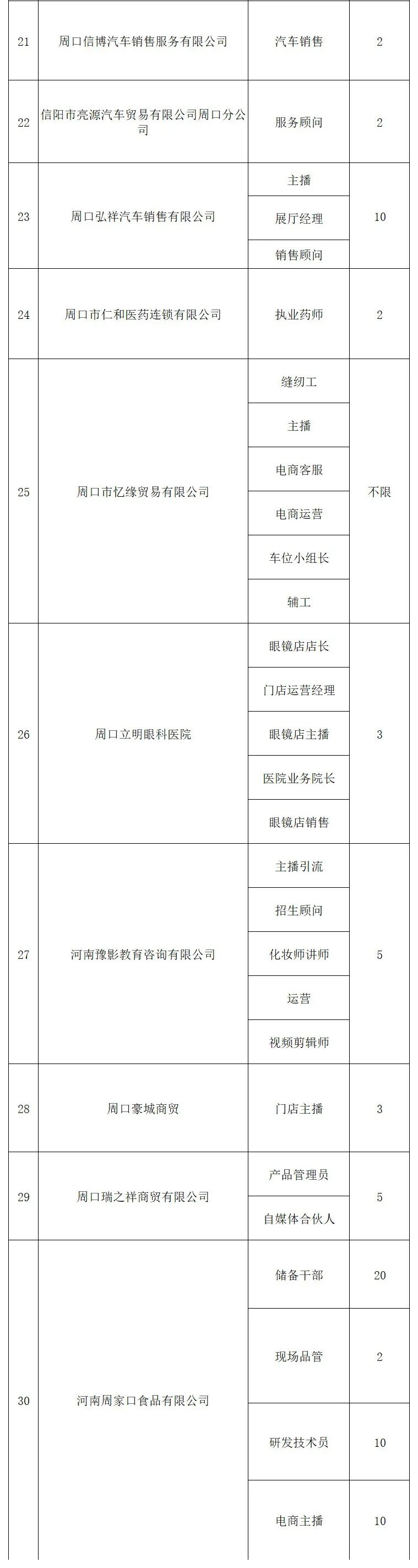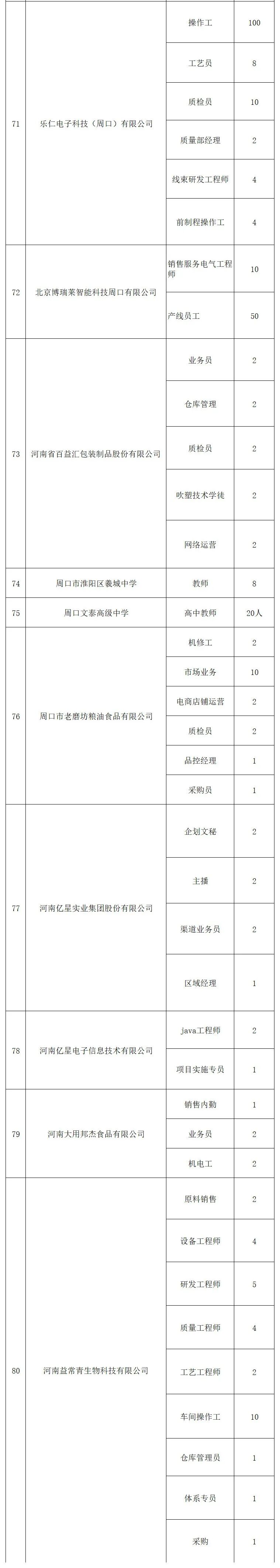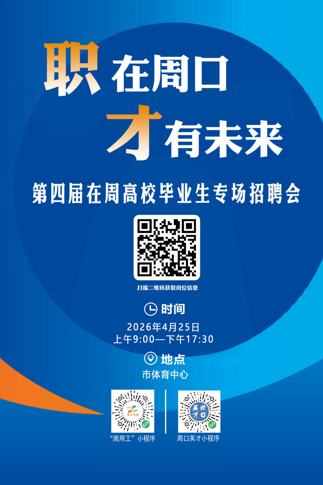 为深入实施人才强市战略 推动更多在周高校毕业生留周就业 保障重点企业用人需求 促进产业和人才深度融合 周口市将于2026年4月25日 星期六 在周口市体育中心举办第四届在周高校毕业生专场招聘会 "职"在周口 "才"有未来 时 间 2026年4月25日 星期六 上午9:00--下午17 30 地 点 周口市体育中心 主办单位 市委组织部 市委人才办 市人力资源和社会保障局 市教育体育局 承办单位 市人才工作服务中心 市创业就业服务中心 市人才集团 协办单位 市市场监督管理局 市工信局 市商务局 团市委 周口师范学院 河南科技职业大学 周口职业技术学院 周口文理职业学院 周口理工职业学院 河南省水利水电学校 周口交通技师学院 求职者可通过"周口英才""周用工"等微信小程序关注招聘会相关信息 4月25日上午9 00携带个人简历参加现场招聘会 本次招聘会将采用以线下招聘 线上直播带岗相结合的形式 充分利用自媒体优势 开展直播带岗位 企业云宣讲 企业HR进直播间互动 招聘会现场展位互动 等活动 充分布局线下+线上同频招聘新业态 保证就业促进活动覆盖面更广 影响力更大 招聘会现场同时设置职业指导 政策咨询 惠企助企政策宣传等 ![]()