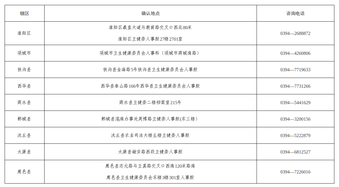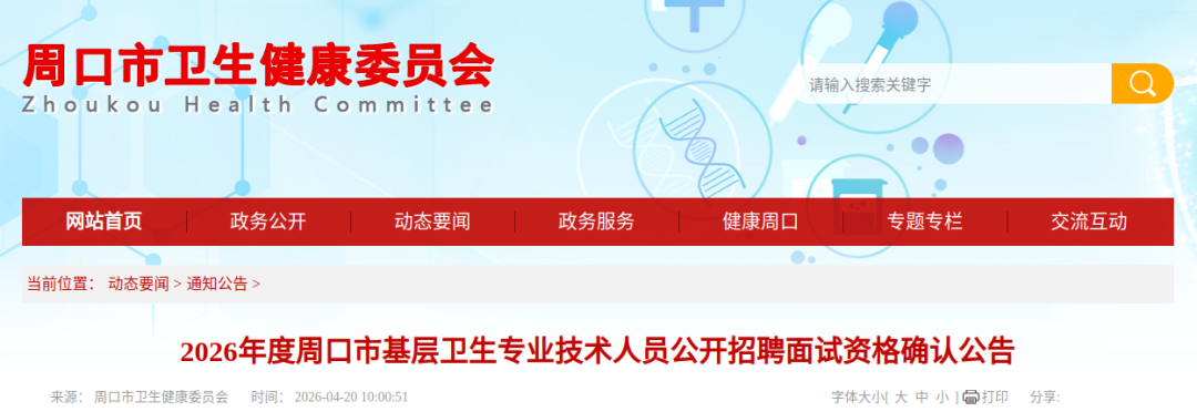 ![]() 根据招聘工作计划安排 现将面试有关事项公告如下 一 面试资格确认 一 确认对象 时间及地点 1. 确认对象 本次公开招聘中 笔试入围面试的人员 免笔试报名审核通过的人员 具体名单可查阅前期官方发布的面试入围名单公告 2.确认时间 4月21日至4月24日9 00-12 00 14 30-17:00 逾期未到场办理面试资格确认 领取面试通知单的 视为自动放弃面试资格 将按照 2026年度周口市基层卫生专业技术人员公开招聘公告 相关规定 启动递补程序 3.确认地点 考生须到本人报考岗位所属辖区的县 市 区 卫生健康委员会办理面试资格确认及领取手续 具体地址如下 ![]() 二 面试资格确认所需提交资料 考生进行面试资格确认时 须本人现场提交以下材料的原件及复印件 复印件请提前按顺序整理装订 原件核对后返还本人 材料不全或不符合要求的 不予通过资格确认 1.本人近期1寸免冠彩色证件照1张 仅免笔试考生提供 背面标注本人姓名及报考岗位代码 2.笔试准考证 仅参加笔试的考生提供 原件及复印件各1份 3.有效期内的二代居民身份证 原件及复印件各1份 若身份证过期或遗失 可提供有效期内的临时身份证或公安机关出具的临时身份证明 原件及复印件各1份 4.补充说明 考生需确保所提供材料真实 完整 有效 若有遗漏或不符 将影响资格确认结果 二 注意事项 一 面试资格确认须考生本人到场办理 严禁委托他人代办 否则视为自动放弃面试资格 二 资格确认通过后 现场发放 2026年度周口市基层卫生专业技术人员公开招聘面试通知单 该通知单是考生参加本次面试的唯一有效凭证 请考生妥善保管 遗失不补 涂改无效 三 资格审查贯穿本次招聘考试 聘用全过程 无论哪个环节发现考生提供材料不实 信息虚假 或不符合招聘岗位条件的 一律取消其面试资格 聘用资格 由此产生的一切后果由考生本人承担 四 面试的具体时间 地点 报到组别 注意事项等 均以 面试通知单 载明的内容为准 请考生仔细阅读通知单信息 按要求准时参加面试 五 考生逾期未办理面试资格确认 未领取面试通知单的 视为自动放弃面试资格 将按招聘公告规定 从该岗位笔试合格人员中按成绩从高到低依次递补 递补人员相关事宜将另行通知 请考生保持通讯畅通 六 资格确认期间 考生可拨打所属辖区县 市 区 卫生健康委员会联系电话咨询相关事宜 咨询时间与资格确认工作时间一致 特此公告 周口市卫生健康委员会 2026年4月20日 |